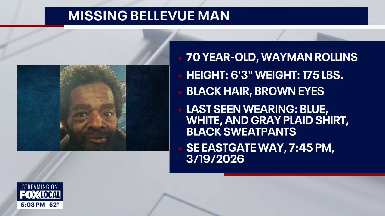 Bellevue police and Washington State Patrol are searching for 70-year-old Wayman Rollins, who has been missing since Thursday night. Authorities say he may need assistance getting home and are urging anyone with information to call 911.