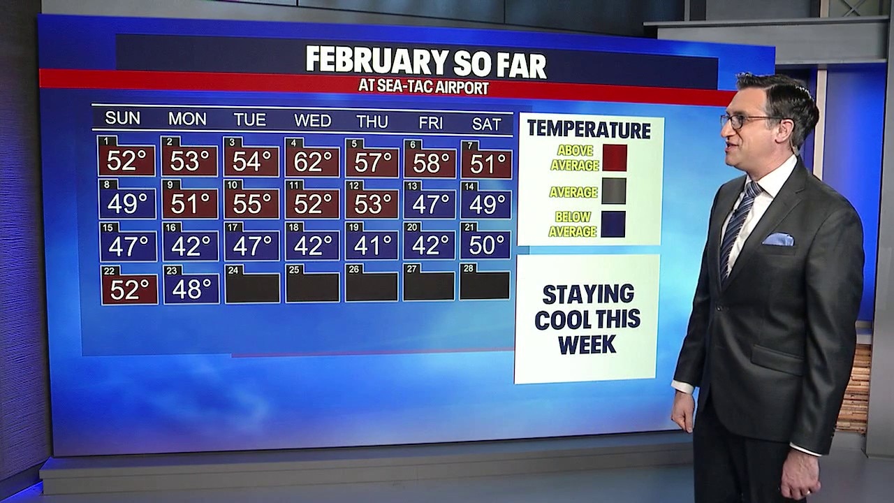 Temperatures Tuesday will be below average, reaching the mid 40s with mostly cloudy skies. You can't rule out a sunbreak for the north sound or a shower to the south, but it will be a relatively calm day.