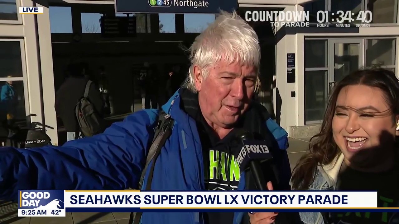 Seahawks fans are pouring into Seattle for the victory parade, but getting downtown is proving tough as light-rail platforms hit capacity and trains arrive jam-packed at Northgate.