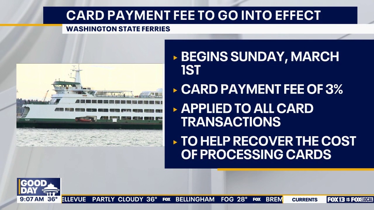 Washington State Ferries will begin charging a 3% fee on all card transactions starting March 1, according to the Washington State Department of Transportation. The fee will apply to fares, no-show charges and carpool permits. Officials say the surcharge is intended to help cover the cost of processing card payments.