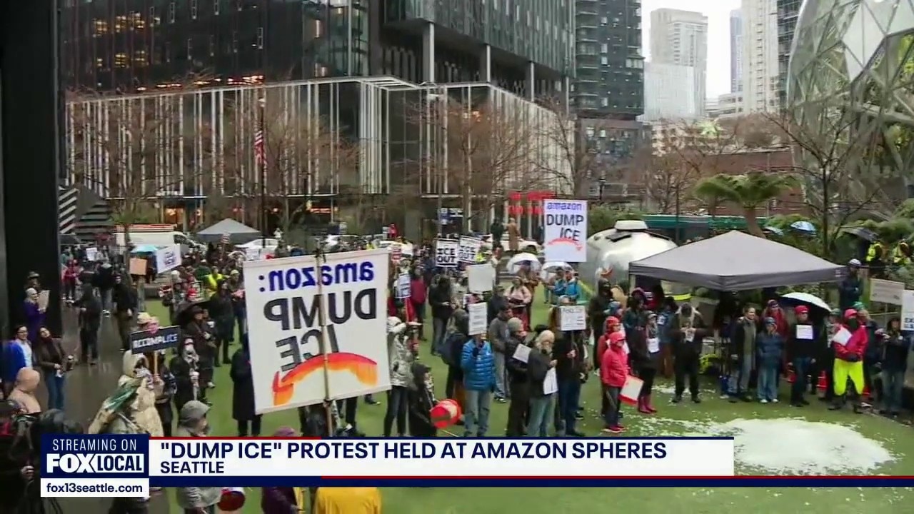 Amazon workers and local groups rallied at the Amazon Spheres in Seattle, urging the company to cut ties with ICE and CBP and end partnerships they say support immigration enforcement.