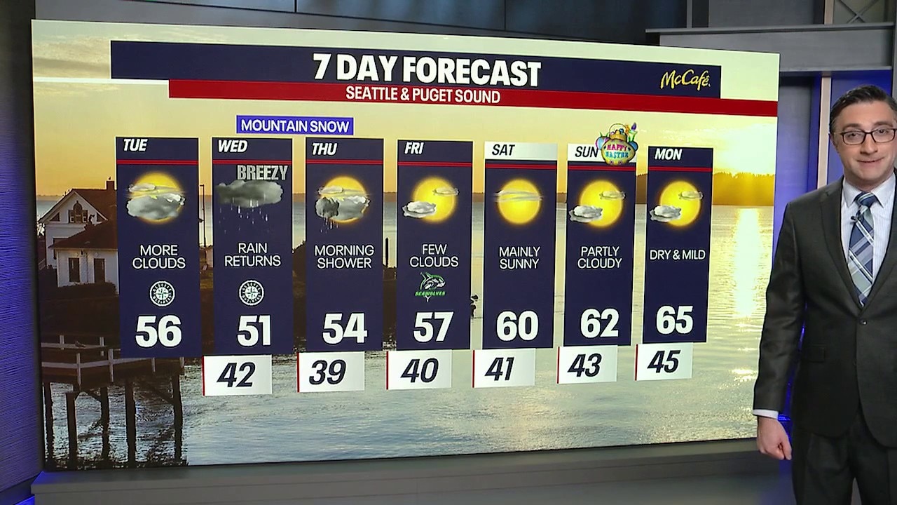Tuesday will be mostly cloudy with patchy morning fog and mild highs in the mid to upper 50s.