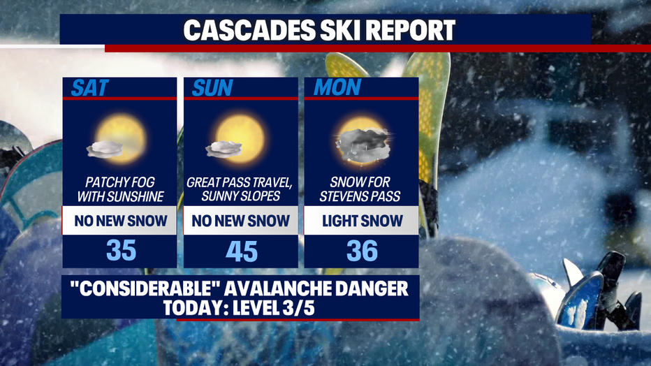 Over the mountain passes, mostly dry weather is on tap through Sunday. There may be some light snow on Monday; no accumulations aren't expected at Snoqualmie Pass, but a little snow could stick to the ground along Stevens Pass.