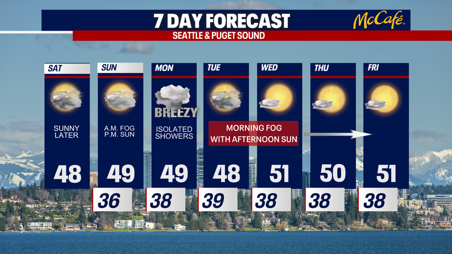 Today, you can expect a mixture of sunshine and clouds. Highs will reach the mid to upper 40s. Sunday's forecast looks pretty similar with highs in the upper 40s as well. Monday, a few showers could sweep through Western Washington. It may be breezy at times on Monday, too.