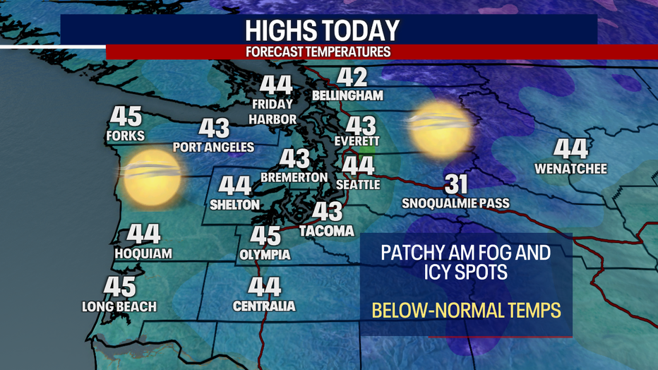 Highs this afternoon will be almost ten degrees below average in Seattle, only reaching the mid 40s. After an icy start in some communities, sparkling sunshine will remain throughout the rest of the day.
