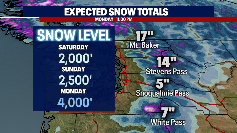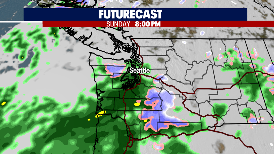 As lowland rain becomes widespread Sunday night into Monday, the mountains will pick up another round of snow. It's the winter season that keeps on giving!