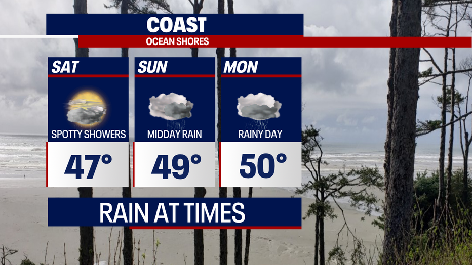 This weekend, we'll see a bit of a break as we're in between systems. Saturday features spotty showers with dry periods and sun breaks in between. Highs warm to near 50.