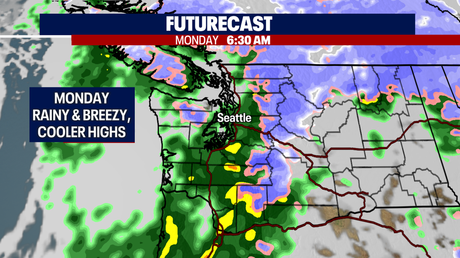 Plan for extra time for your Monday morning commute! Rain will become heavy at times. Highs cool a few degrees into the upper 40s.
