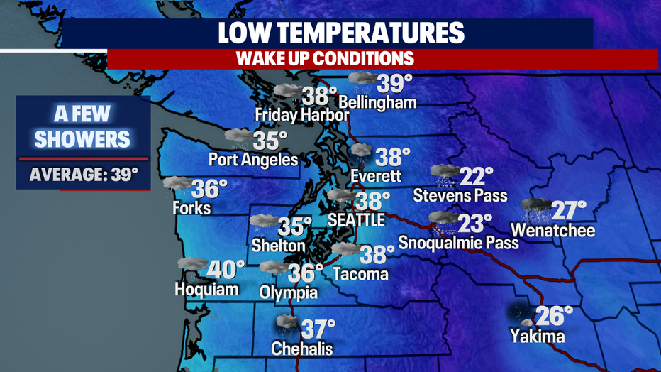 Overnight, we expect a few scattered showers with lows cooling in the mid to upper 30s.