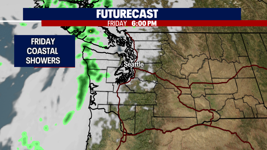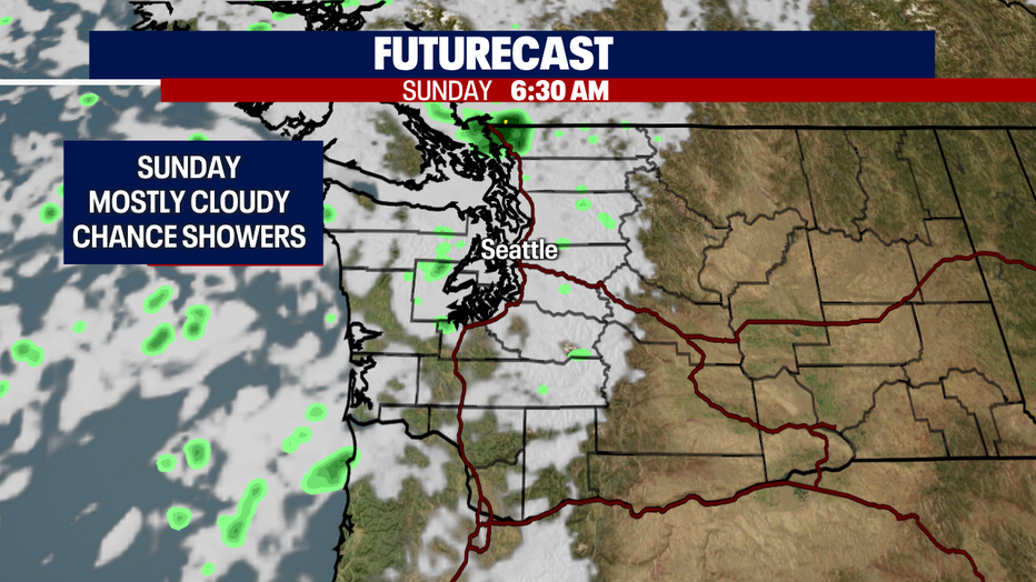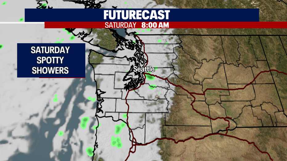 By Sunday, we'll see another chance of showers as a system moves onshore. We're not talking about widespread showers-- we're mainly watching the North Sound in Whatcom County. Almost everyone else hangs under partly cloudy skies with highs in the upper 60s to low 70s.