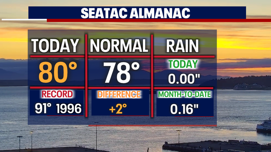 SEATTLE - Temperatures soared into the low 80s in south Seattle with temperatures in the 70s for the north Sound and 60s at the coast. Sea-Tac hit 80 Thursday, making that just the fourth day in the 80s this year. And if we're counting… we've only had two days in the 90s.