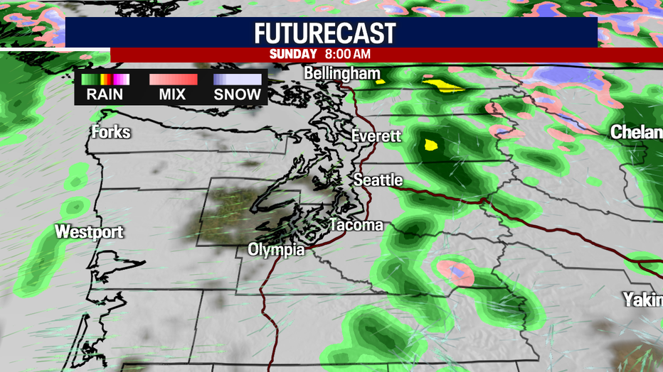 We manage to hold off rain for most of Sunday, but by dinner time showers push inland becoming widespread as an upper trough passes over the region. Winds pick up at times out of the SSW for breezy conditions.