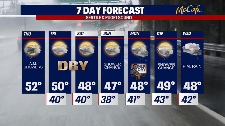Seattle - Morning showers should end midday, leaving the Puget Sound area with dry and partly cloudy conditions the second half of Thursday.
