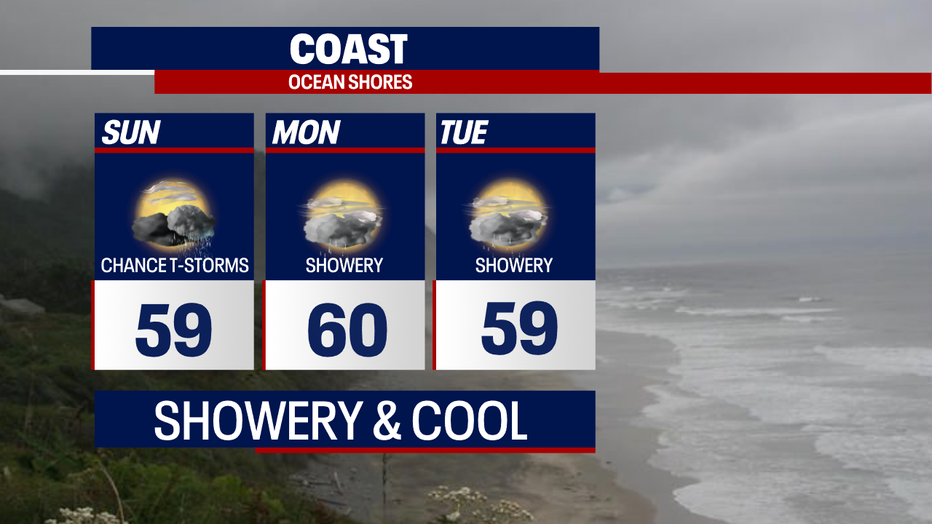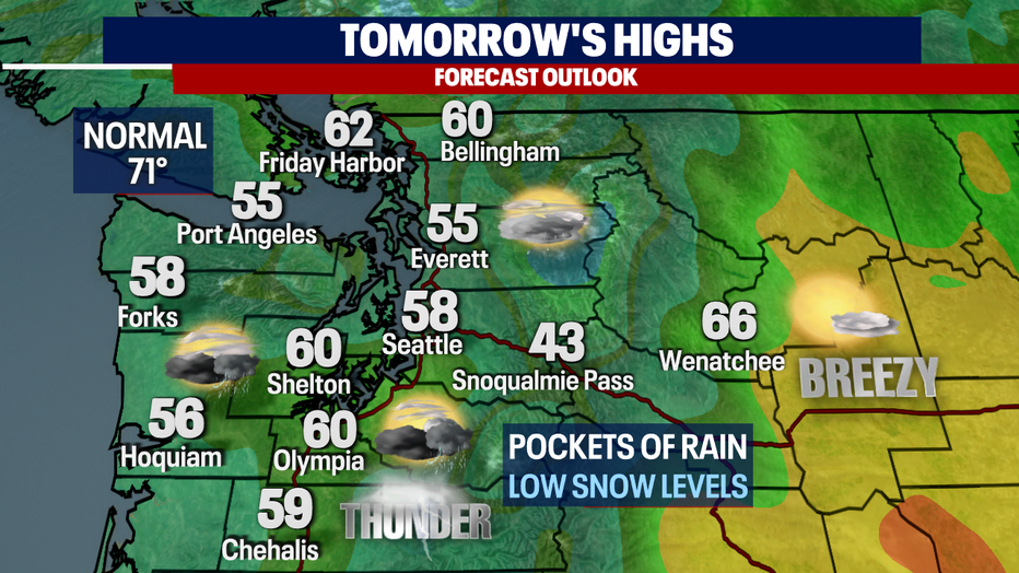 Not only will we experience widespread, scattered rain, at times some of us might see a few thunderstorms firing up. Areas to watch… the foothills, Cascades, and Central and South coast.
