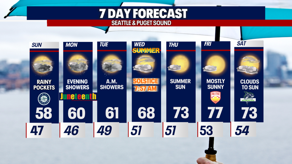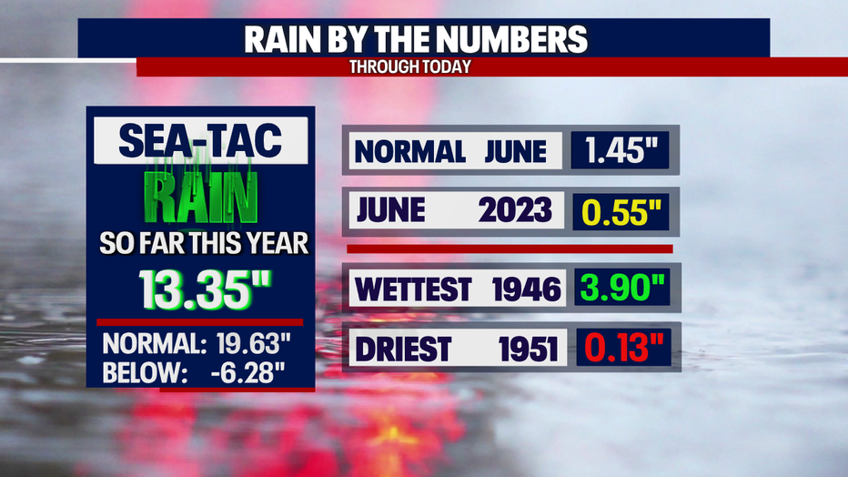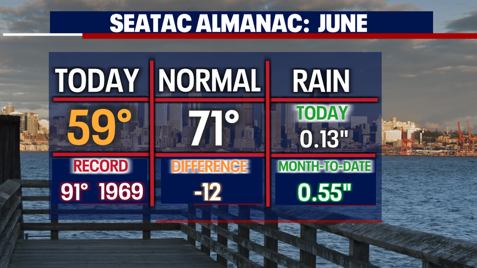 Seattle - We were 12 degrees below average at the airport Saturday. We did manage to pick up 0.13" of rain at SeaTac, which now gives us 0.55" for the month of June.