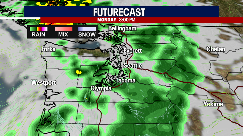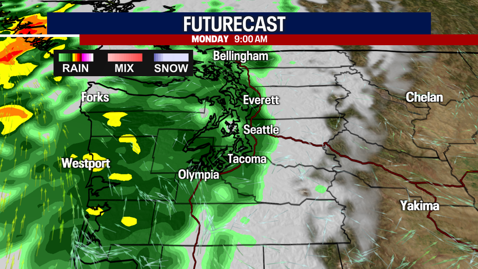 Here's a peek at futurecast showing us the timing of the rain around the region. By 9am rain pushes inland across Puget Sound into the foothills.