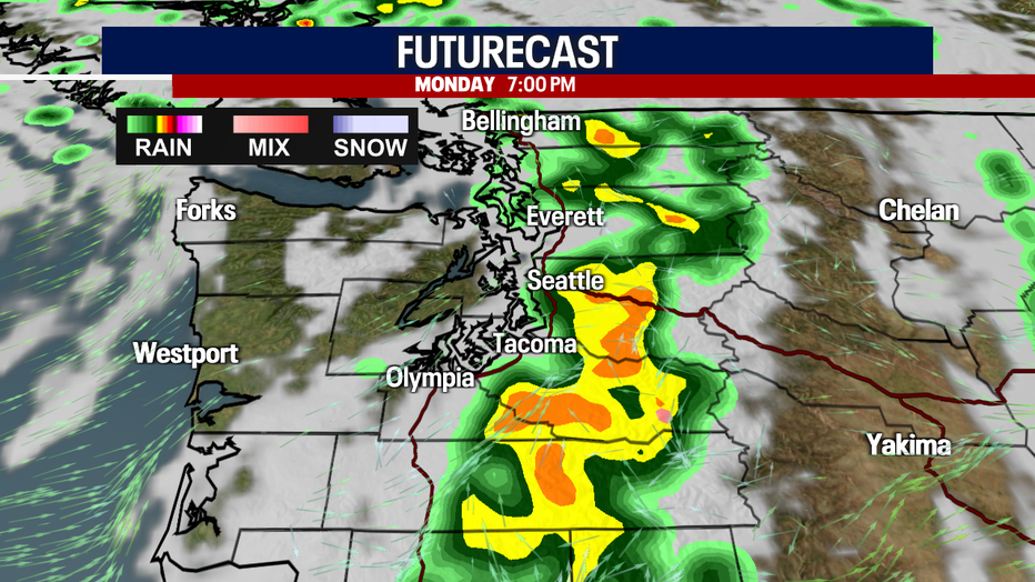Another wave of rain picks up just after dinner time with the heaviest cells south and east of Seattle, mainly over the foothills and Cascades.