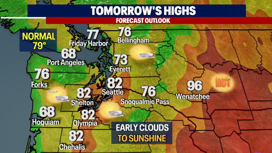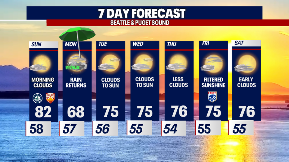 Sunday will look a lot like Saturday with morning clouds giving way to afternoon sunshine. Highs warm into the low 80s around Puget Sound.