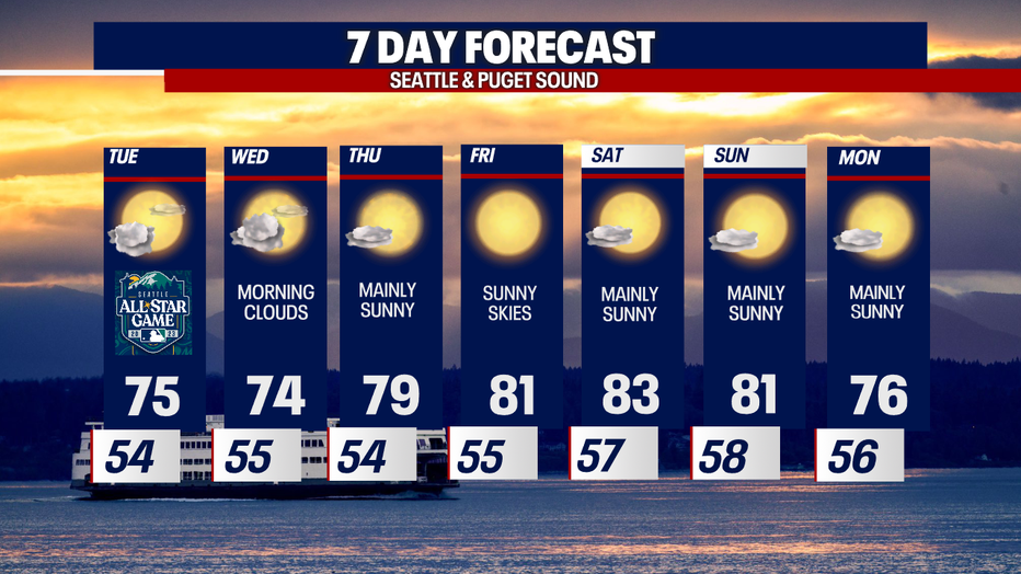 Seattle - If you're planning on heading down to the game tomorrow - the weather should be awesome! We'll kick off the day with gray skies, but they'll break for more sunshine in the afternoon. Temperatures will peak in the mid-70s and quickly full back into the 60s around sunset (9:06 pm). Here is a look at your All-Star Game Day forecast: