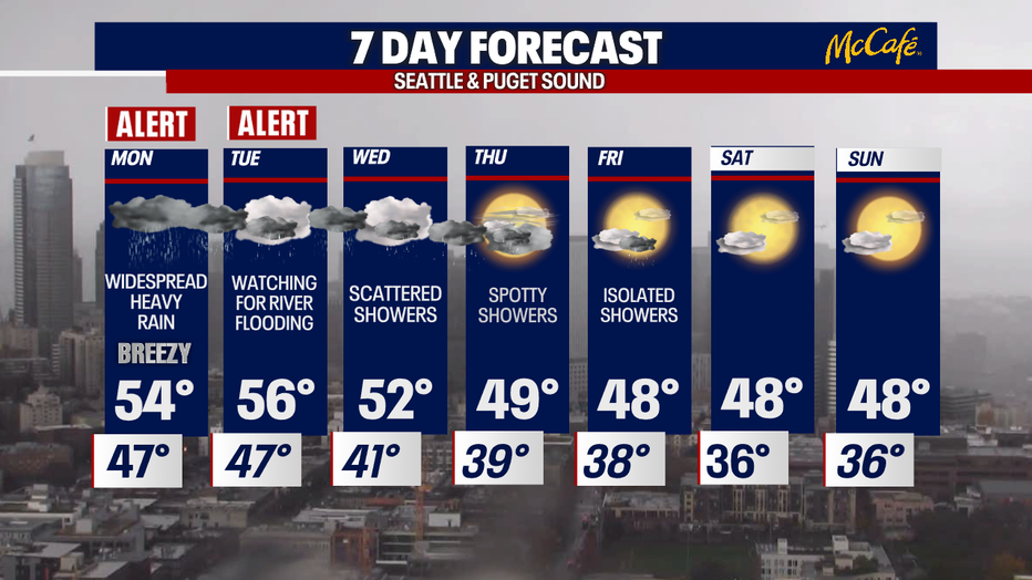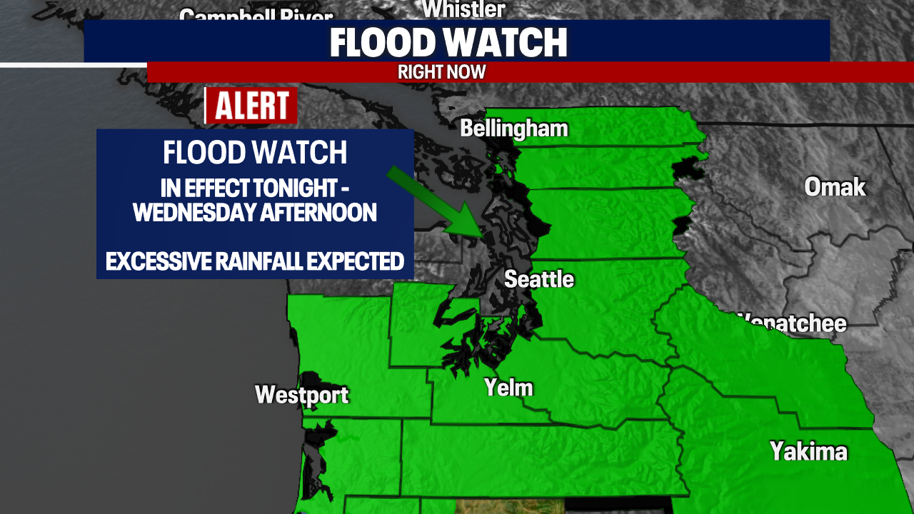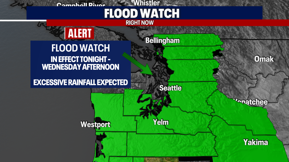 The Flood Watch is in effect due to excessive runoff (heavy rain and snow melt) which will increase the flow to our rivers. This is huge because it could cause minor-major river flooding. I'm keeping my eye on the following rivers: Skagit near Concrete, Skykomish by Gold Bar, Tolt near Carnation, Snoqualmie near Carnation and Snoqualmie, Skokomish near potlatch, Cowlitz at Randle, and Nisqually near National. These rivers could crest on Tuesday!