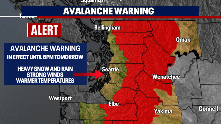 On top of the heavy rain and runoff, we'll have to be on the lookout for avalanches due this is drastic change in the weather (Cascades). As the snow tonight transitions to heavy rain tomorrow, this threat elevates! To top that off, gusty winds will kick up too. This will make for dangerous conditions across the Cascades. You'll want to avoid the area as the snow level rises and the Avalanche Warning remains in effect.