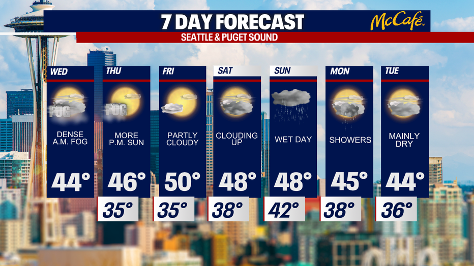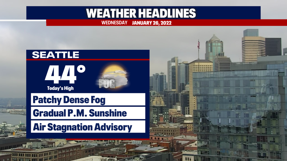 SEATTLE - A ridge of high pressure continues to keep the Pacific Northwest dry with foggy nights and mornings. Dense fog impacted the Puget Sound area for Wednesday morning's commute.