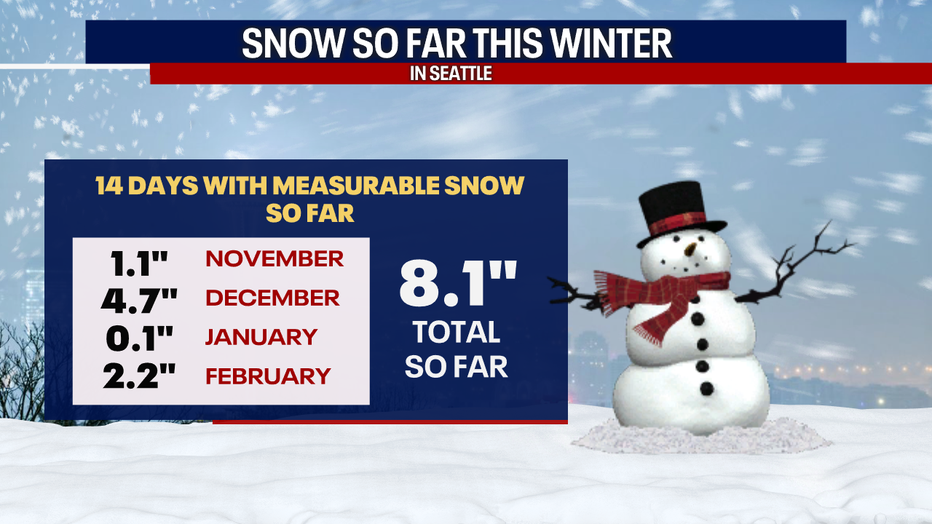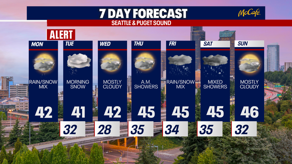 SEATTLE - A cold air mass will bring Western Washington another chance of snow late Monday night into Tuesday morning as a low pressure system moves onshore.