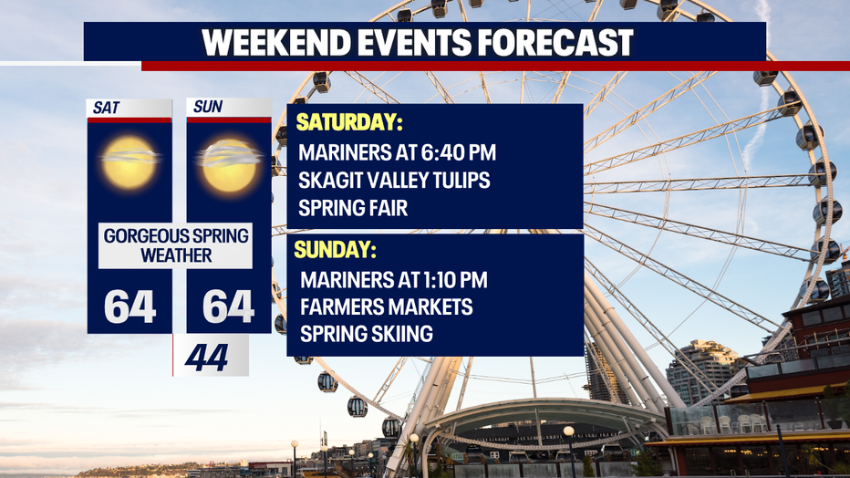 The weather will hold up beautifully for all sorts of events around the region, including the Mariners, the Puyallup Spring Fair, the Skagit Valley Tulip Festival, spring skiing or just heading to the park or playground with the family.