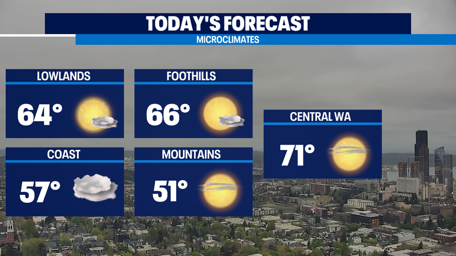 Today we're transitioning back to that more seasonal April weather pattern. Morning clouds will clear out nicely this afternoon. The sun's energy will be spent eradicating the clouds instead of heating things up-- so we'll be about 10-15 degrees cooler than yesterday's highs in the low 70s. The exception is Central Washington still clinging to those warmer temps this afternoon.