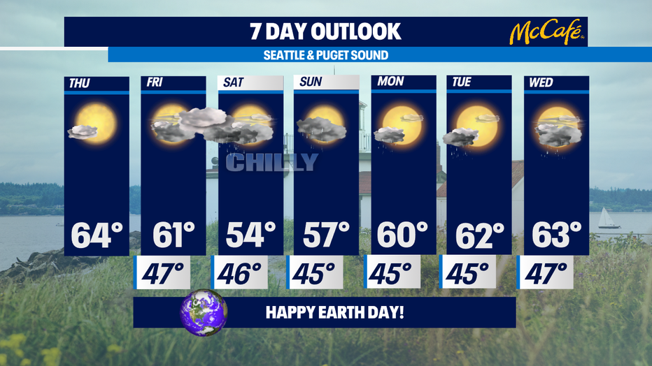 Seattle - Happy Earth Day! Today is our transition day between last weekend's high temps in the low 80s to this coming weekend which will be back to seasonally soggy conditions and temps significantly cooler.