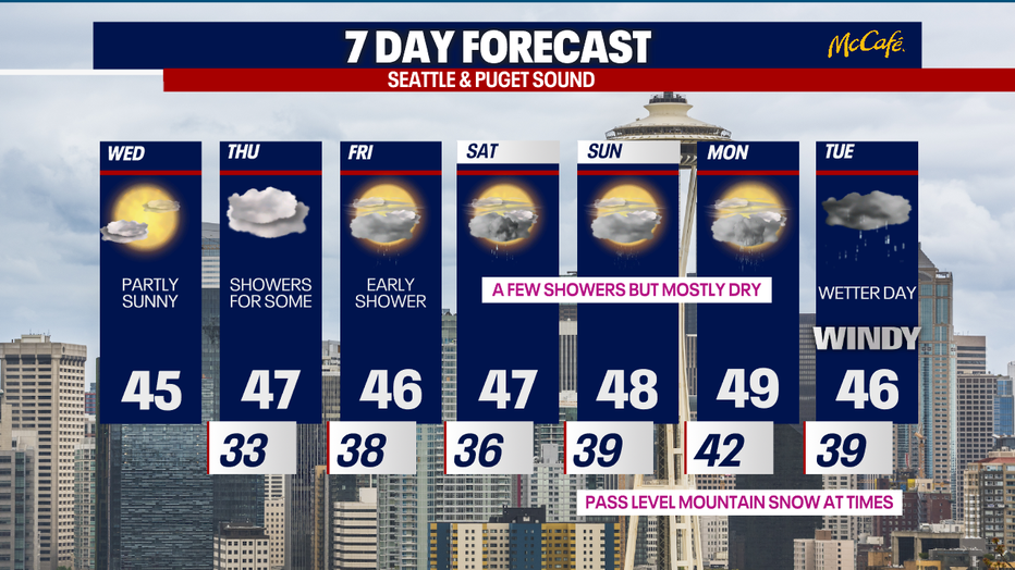 Enjoy our spectacular sunshine today! Clouds roll in again Thursday with showers possible at times. Forecast models are hinting that next week could be much cooler around Western Washington.