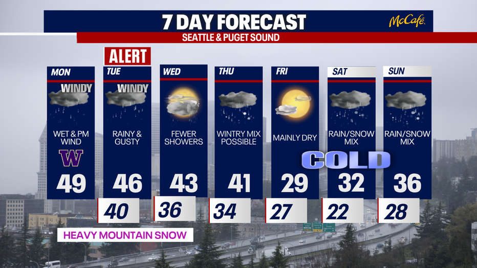 Seattle - Monday will bring wet and gray conditions to Western Washington, but a much stronger system will hit Tuesday bringing wind, rain, and significant mountain snow.