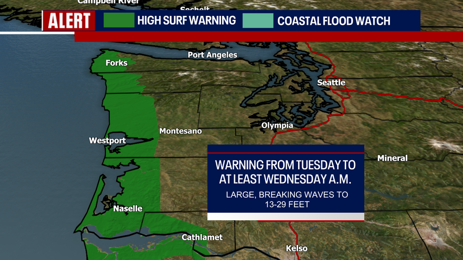 Large waves will also be an issue on the coast from Tuesday to Wednesday morning. Breaking waves could be as high as 13 to 29 feet.