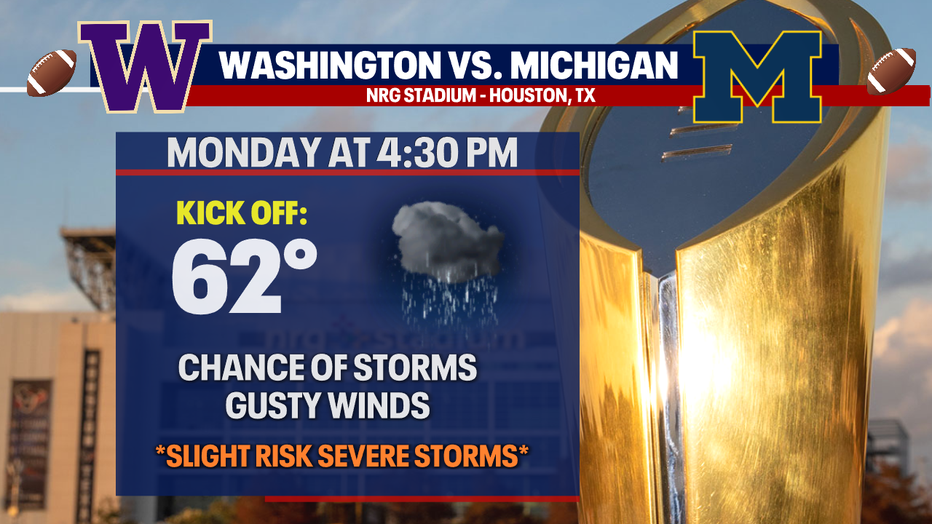 It's a massive day for Husky Football as the Dawgs take on Michigan in the College Football Playoff Championship Game in Houston. Today's weather will be stormy in the greater Houston area with a slight chance of severe thunderstorms.