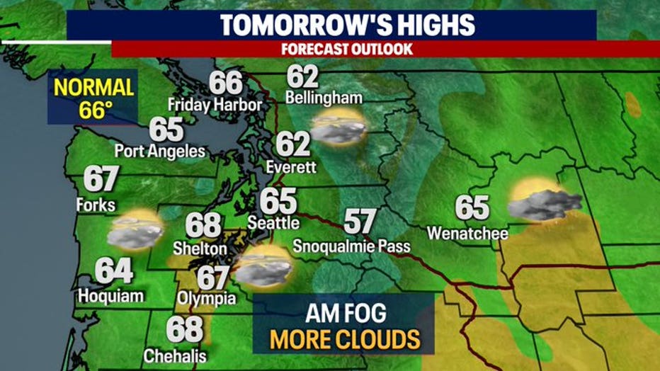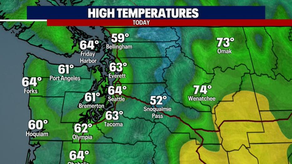 SEATTLE - A mix of sun and clouds for Tuesday in the Pacific Northwest with highs today topping out in the low 60s. Average high temperatures for this day is 67F, so a little cooler than normal.