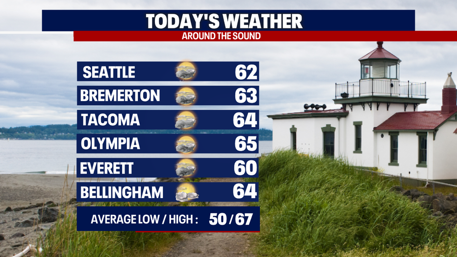 Highs will only warm a few more degrees landing in the low to mid 60s across Western WA.