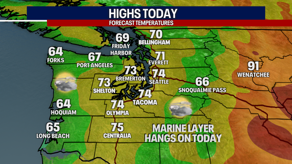 A low pressure system is bringing widespread cloud cover west of the Cascades this morning. Temps will be cooler than average today in the low to mid 70s around the Puget Sound area with sunshine in the mix by the evening commute.
