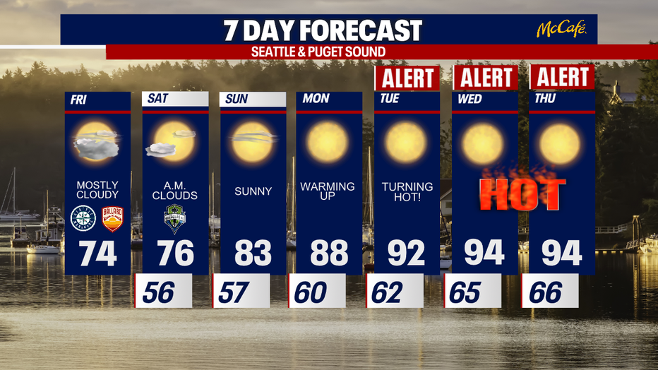 Seattle - It will be cloudier and cooler across Western Washington Friday and Saturday, but next week will likely be the hottest of the year so far.