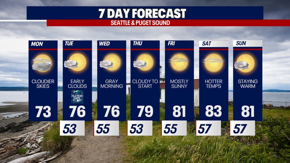 Seattle - A stronger onshore push of cooler air and cloud cover will keep temperatures in the upper 60s and low 70s Monday afternoon.