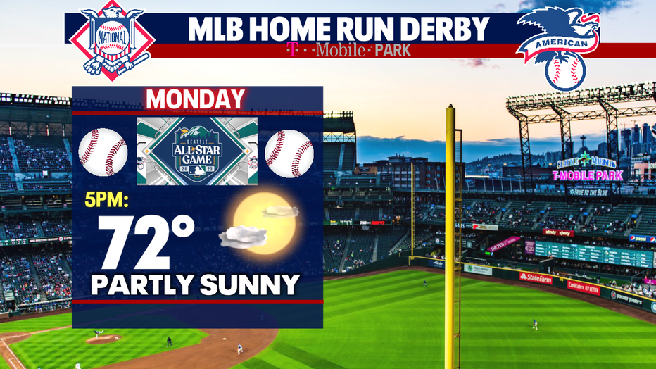 It's a big night in SoDo! The Major League Baseball Home Run Derby starts at 5:00 PM and the weather should be fantastic. Temps will be around 72 degrees as the derby starts with partly to mostly cloudy skies.