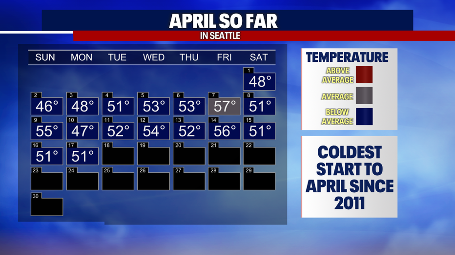 April remains cool as we move forward this week. In fact, this is the coldest start to April since 2011 and the 8th coldest on record at Sea-Tac.