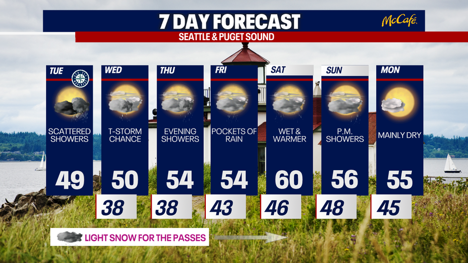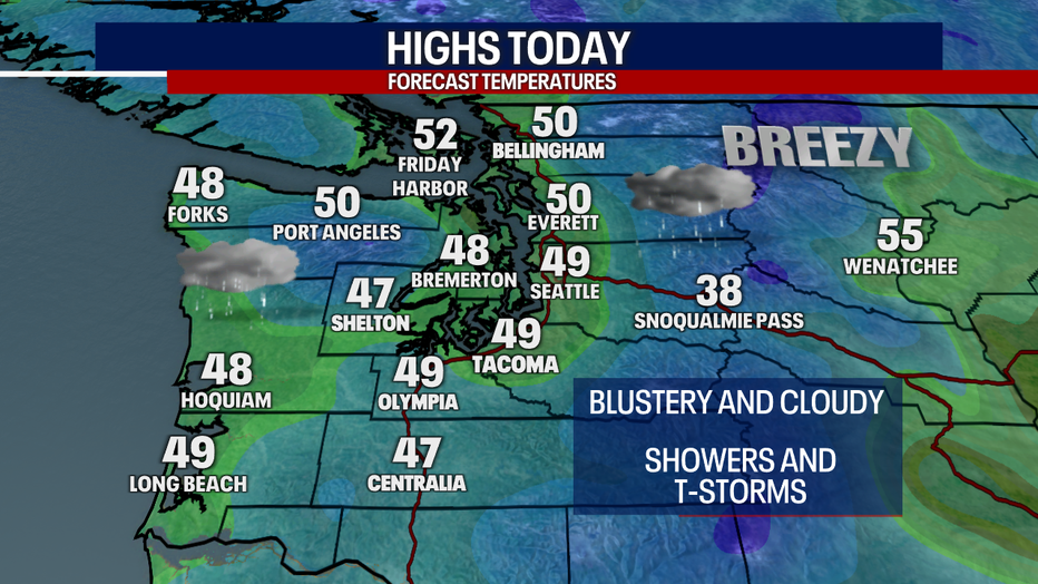 SEATTLE - Another wet and windy system is sweeping through Western Washington Tuesday, bringing cool temperatures as well.