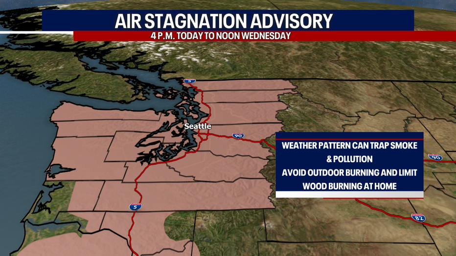 An Air Stagnation Advisory is in effect from 4 o'clock this afternoon to noon Wednesday. Our quiet weather pattern could trap smoke and car/industrial pollution in our skies. Not only could this give us "filtered sun" or hazy skies, lower air quality could create issues for folks with breathing problems. Puget Sound Clean Air Agency says that air quality levels could drop to "moderate" or "unhealthy for sensitive groups." Experts are asking everyone to avoid outdoor burning and limit wood-burning heating (unless it's your only heating source).