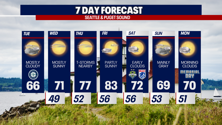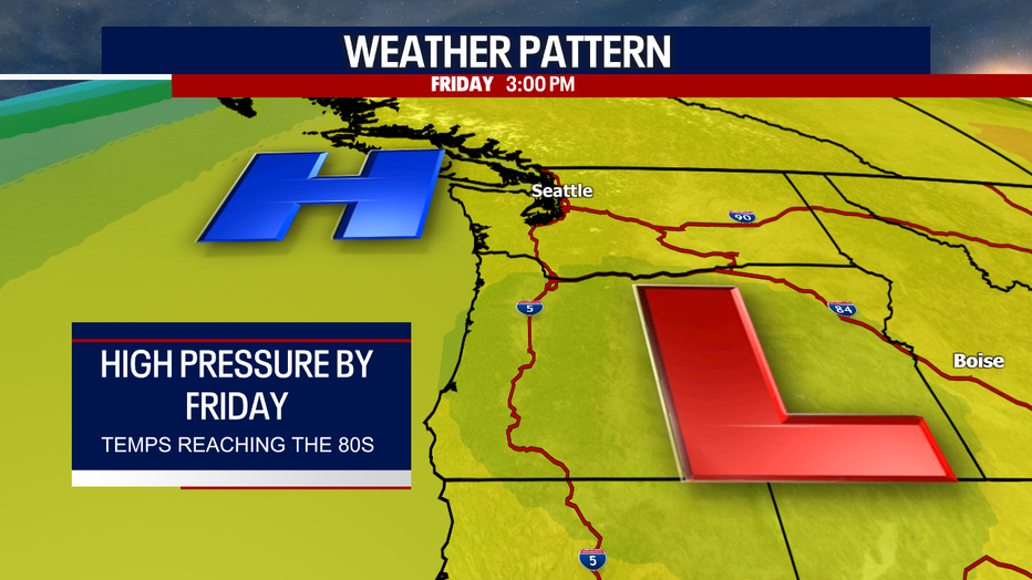 Starting Wednesday, a ridge of high pressure will begin to build over the Pacific Northwest, but the cut-off low will hang around just south of Washington State. That low could bring some more showers or thunderstorms to the Cascades, while Western Washington looks mainly dry and sunny with warming high temperatures.