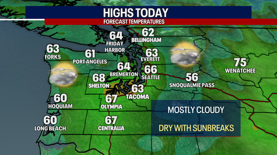Seattle - A low pressure system setting over the Pacific Northwest will bring clouds Tuesday afternoon with temps back into the mid 60s.