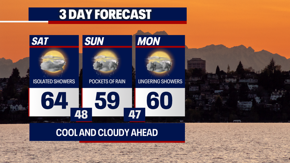 Today, highs will be rather limited thanks to an upper-level low pressure system hovering nearby. A few spotty showers are possible, particularly in Snohomish County this afternoon and tonight. Keep a light rain jacket with you.