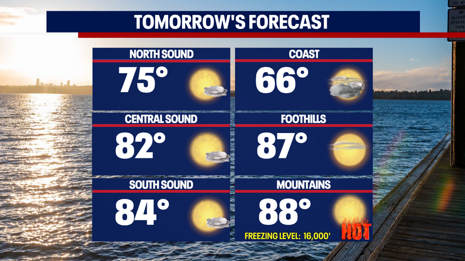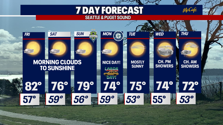 The high pressure that's driving our forecast will hang with us through Friday, keeping temperatures several degrees warmer than normal. Our seasonal high for this time of year is now 75. Friday, we're forecasting temperatures in the low 80s for Seattle.