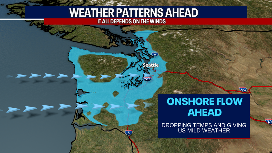 We're tracking an onshore push today. These westerly winds are ushering in cooler air from the Pacific. Most of us will be dry today, but there could be showers and spotty thunderstorms over the Cascades (primarily east of the Cascade Crest).