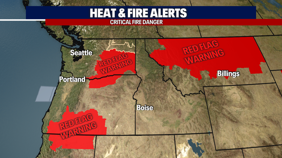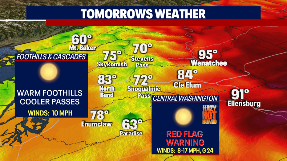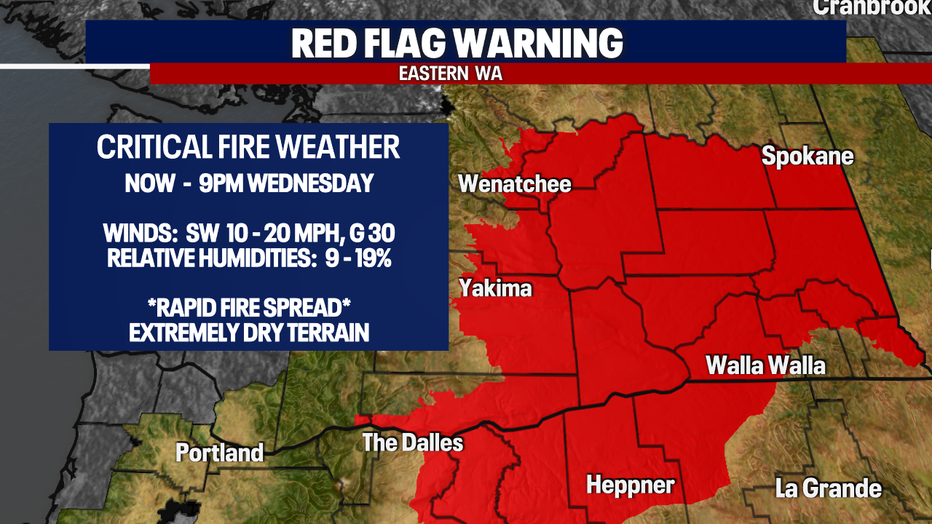 Unfortunately, fire danger is still critical east of the mountains. A Red Flag Warning remains in effect through 9 p.m. Wednesday as strong gusty winds combined with relative low humidity along with temperatures in the mid to upper 90s create a very dangerous recipe for fires to take off.