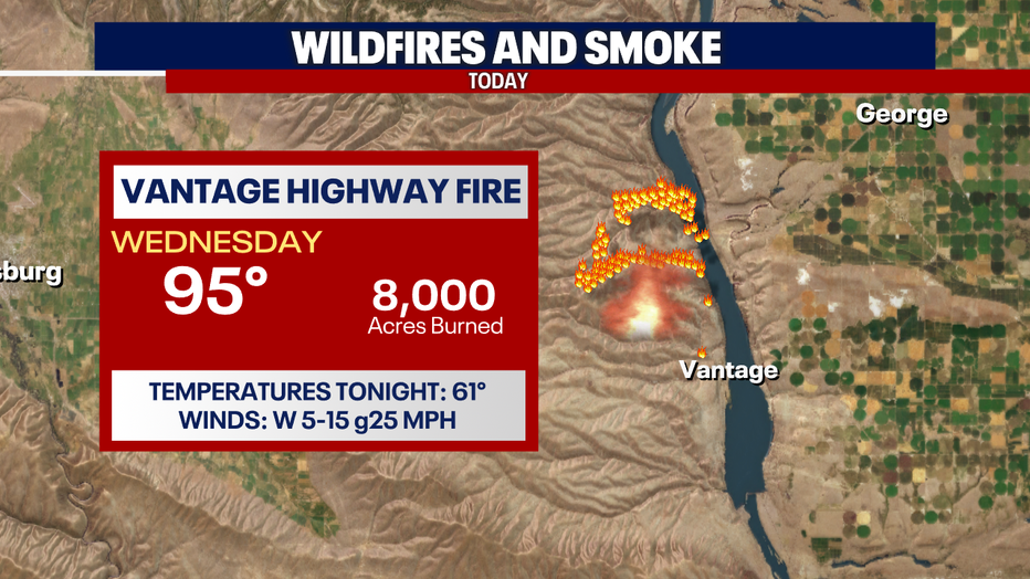 Right now, we're keeping an eye on the Vantage Highway Fire that has already burned more than 10,000 acres. Winds are expected to subside some, but not enough to stop this rapid moving fire. So far, firefighters have only 10% containment. Tomorrow's forecast calls for highs in the mid 90s with gusts out of the west up to 24 mph.
